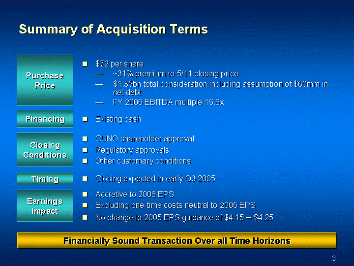 | Summary of Acquisition Terms $72 per share ~31% premium to 5/11 closing price $1.35bn total consideration including assumption of $60mm in net debt FY 2006 EBITDA multiple 15.6x Financially Sound Transaction Over all Time Horizons Purchase Price Financing Existing cash Closing Conditions CUNO shareholder approval Regulatory approvals Other customary conditions Timing Closing expected in early Q3 2005 Earnings Impact Accretive to 2006 EPS Excluding one-time costs neutral to 2005 EPS No change to 2005 EPS guidance of $4.15 - $4.25 |