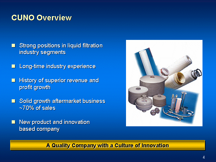 | CUNO Overview Strong positions in liquid filtration industry segments Long-time industry experience History of superior revenue and profit growth Solid growth aftermarket business ~70% of sales New product and innovation based company Potable Water 48 Healthcare 27 Fluid Processing 25 A Quality Company with a Culture of Innovation |