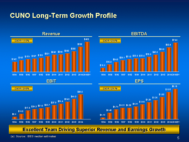 | CUNO Long-Term Growth Profile Revenue EBITDA EBIT EPS 1994 143 1995 163 1996 179 1997 187 1998 199 1999 221 2000 243 2001 244 2002 258 2003 288 2004 352 2005 422 CAGR = 10.3% 1994 10 1995 18.2 1996 24.2 1997 29.1 1998 31.8 1999 33.6 2000 33.6 2001 38 2002 43.5 2003 50.5 2004 62.4 2005 74.6 CAGR = 20.0% 1994 5 1995 10.8 1996 17.5 1997 20.2 1998 21.6 1999 23.7 2000 27.9 2001 30.4 2002 34.9 2003 40.2 2004 49.5 CAGR = 25.8% 1994 0.13 1995 0.45 1996 0.7 1997 0.81 1998 0.82 1999 0.91 2000 1.05 2001 1.2 2002 1.36 2003 1.58 2004 1.93 2005 2.15 CAGR = 29.1% Excellent Team Driving Superior Revenue and Earnings Growth 1994 1995 1996 1997 1998 1999 2000 2001 2002 2003 2004 2005E(a) 1994 1995 1996 1997 1998 1999 2000 2001 2002 2003 2004 2005E(a) 1994 1995 1996 1997 1998 1999 2000 2001 2002 2003 2004 1994 1995 1996 1997 1998 1999 2000 2001 2002 2003 2004 2005E(a) Source: IBES median estimates |