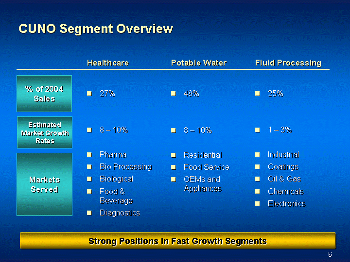 | CUNO Segment Overview 27% 8 - 10% Pharma Bio Processing Biological Food & Beverage Diagnostics 25% 1 - 3% Industrial Coatings Oil & Gas Chemicals Electronics Healthcare Potable Water Fluid Processing Markets Served 48% 8 - 10% Residential Food Service OEMs and Appliances Estimated Market Growth Rates Strong Positions in Fast Growth Segments % of 2004 Sales |