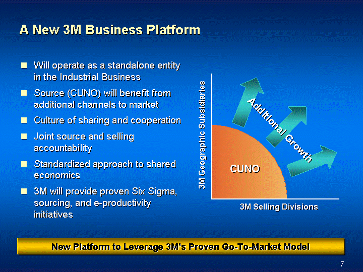 | A New 3M Business Platform Will operate as a standalone entity in the Industrial Business Source (CUNO) will benefit from additional channels to market Culture of sharing and cooperation Joint source and selling accountability Standardized approach to shared economics 3M will provide proven Six Sigma, sourcing, and e-productivity initiatives New Platform to Leverage 3M's Proven Go-To-Market Model 3M Geographic Subsidiaries 3M Selling Divisions CUNO Additional Growth |