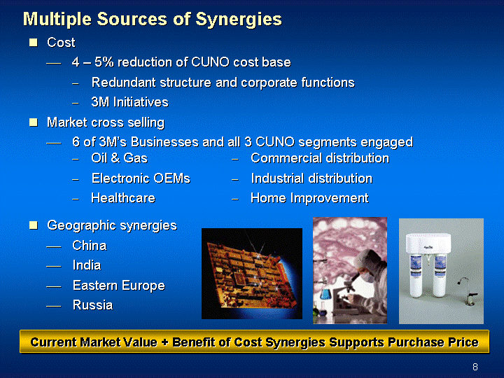 | Multiple Sources of Synergies Current Market Value + Benefit of Cost Synergies Supports Purchase Price Cost 4 - 5% reduction of CUNO cost base Redundant structure and corporate functions 3M Initiatives Market cross selling 6 of 3M's Businesses and all 3 CUNO segments engaged Oil & Gas Electronic OEMs Healthcare Commercial distribution Industrial distribution Home Improvement Geographic synergies China India Eastern Europe Russia |