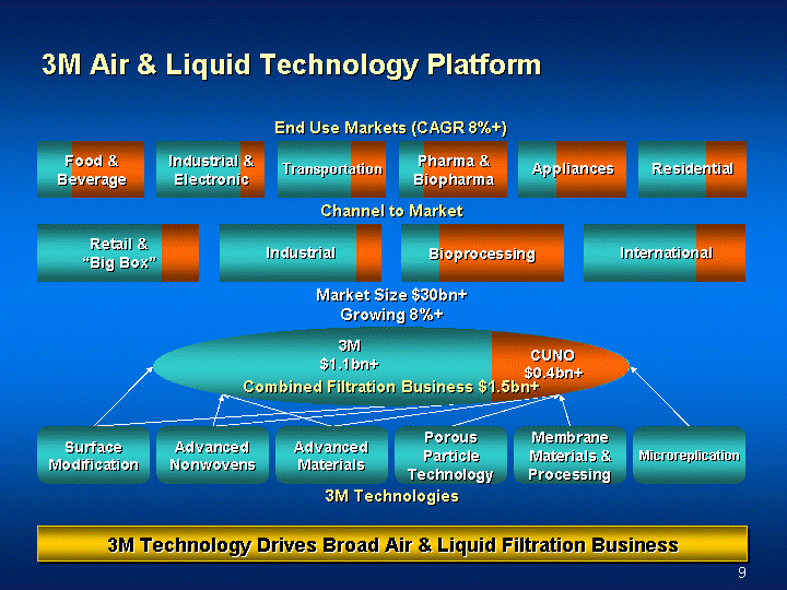 | 3M Air & Liquid Technology Platform 3M Technology Drives Broad Air & Liquid Filtration Business 3M Technologies Industrial & Electronic Transportation Pharma & Biopharma Appliances Residential Industrial Bioprocessing International Market Size $30bn+ Growing 8%+ 3M $1.1bn+ CUNO $0.4bn+ Combined Filtration Business $1.5bn+ Channel to Market End Use Markets (CAGR 8%+) |