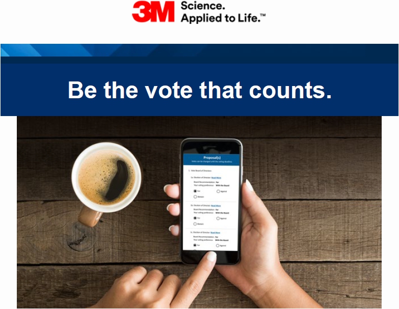 As a 3Mer and shareholder, you contribute to 3M’s business growth and financial strength, you share in the risk and rewards, and you benefit from our Company’s success. We encourage you to both understand and vote on the proposals being considered at this year’s Annual Meeting.